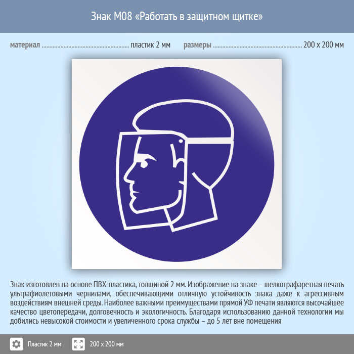 Знак M08 «Работать в защитном щитке» (пластик, 200х200 мм) в Кашире купить