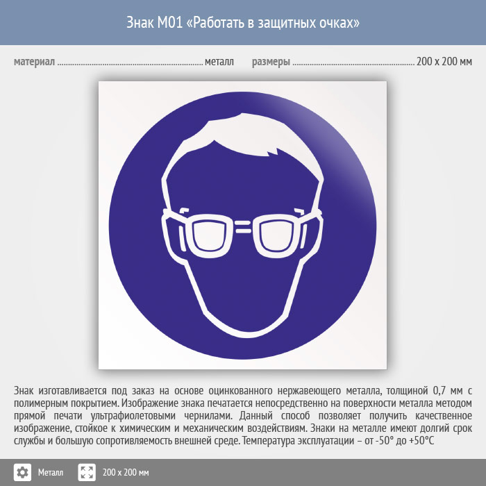 Знак M01 «Работать в защитных очках» (металл, 200х200 мм) в Кашире купить