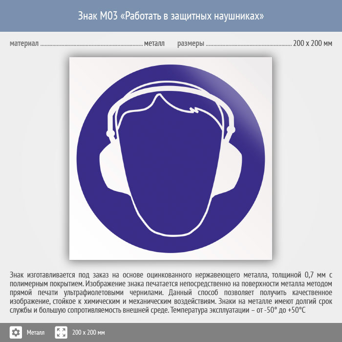 Знак M03 «Работать в защитных наушниках» (металл, 200х200 мм) в Кашире купить