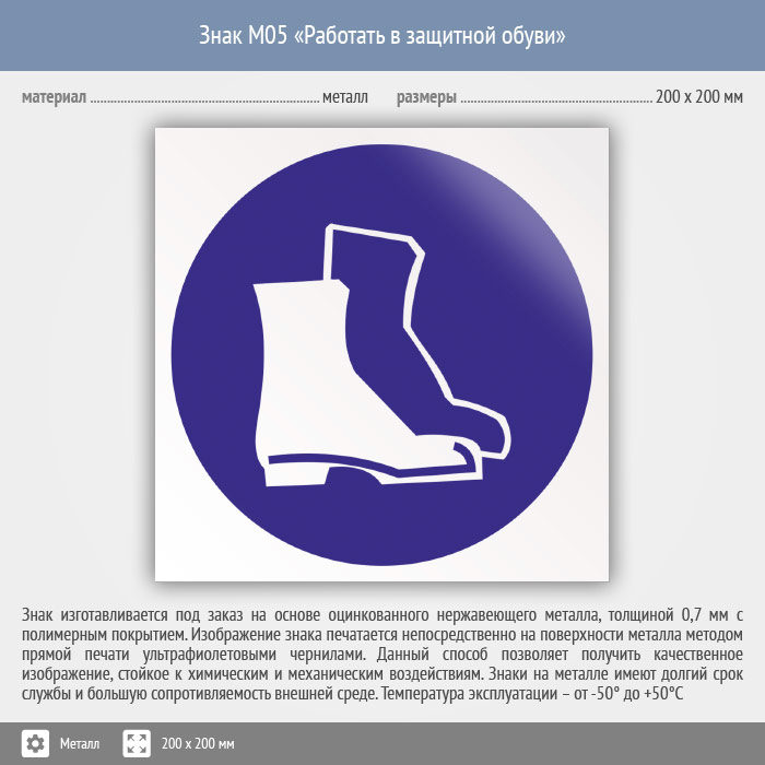 Знак M05 «Работать в защитной обуви» (металл, 200х200 мм) в Кашире купить