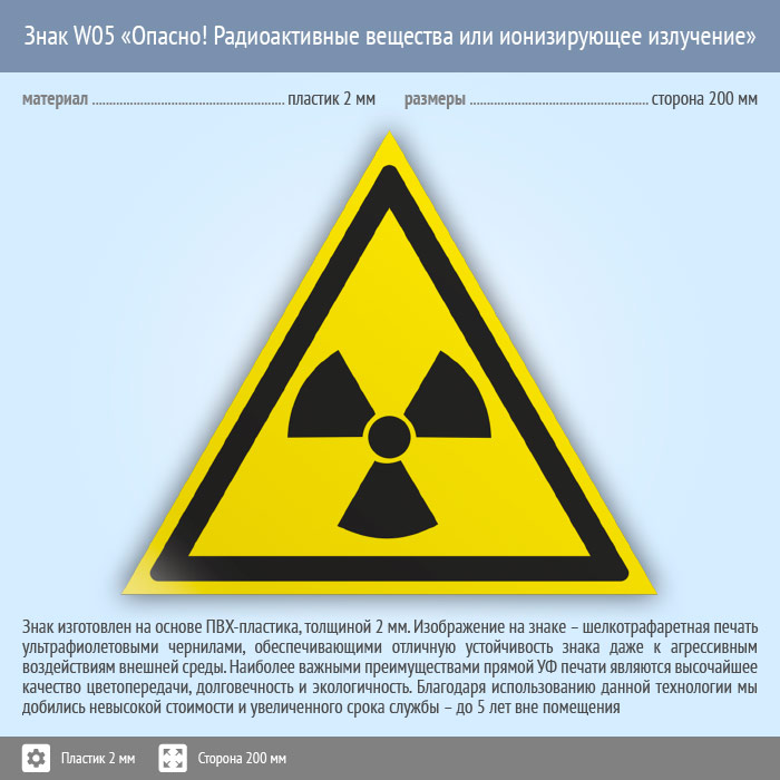 Знак W05 «Опасно! радиоактивные вещества или ионизирующее излучение» (пластик, сторона 200 мм) в Кашире купить