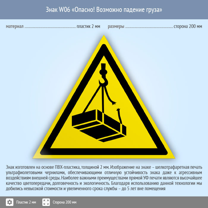 Знак W06 «Опасно! возможно падение груза» (пластик, сторона 200 мм) в Кашире купить
