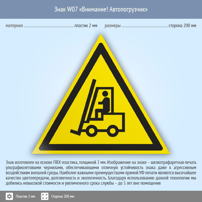 Знак W07 «Внимание! автопогрузчик» (пластик, сторона 200 мм) в Кашире купить
