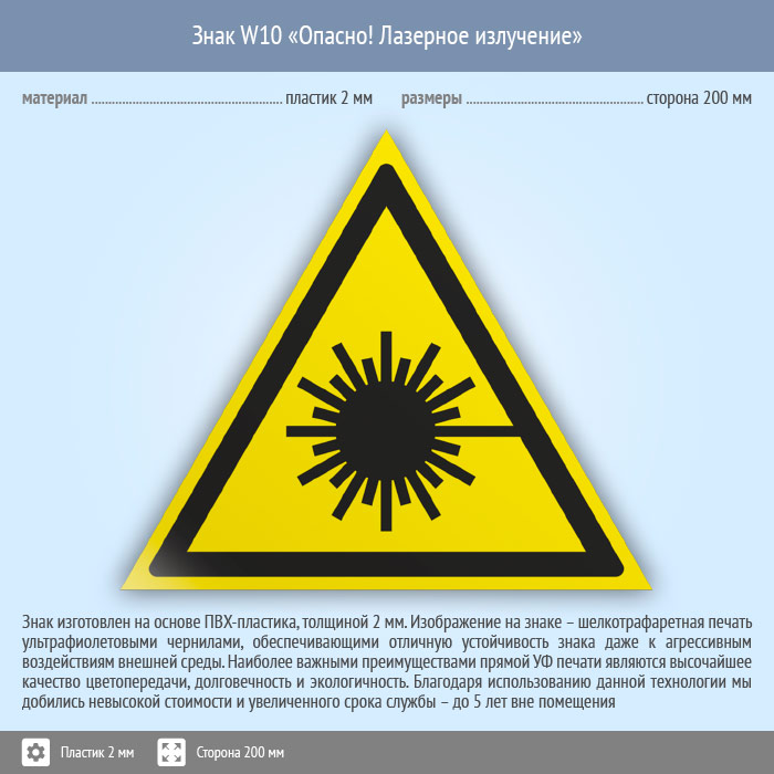 Знак W10 «Опасно! лазерное излучение» (пластик, сторона 200 мм) в Кашире купить