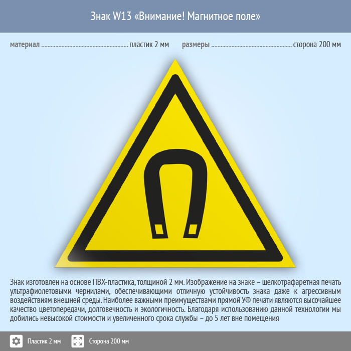 Знак W13 «Внимание! магнитное поле» (пластик, сторона 200 мм) в Кашире купить