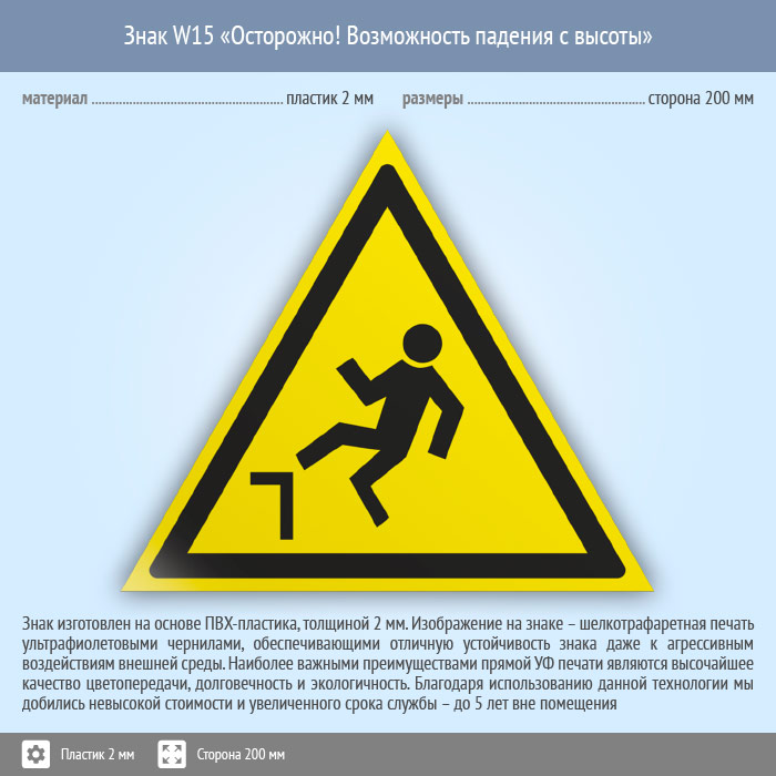 Знак W15 «Осторожно! возможность падения с высоты» (пластик, сторона 200 мм) в Кашире купить