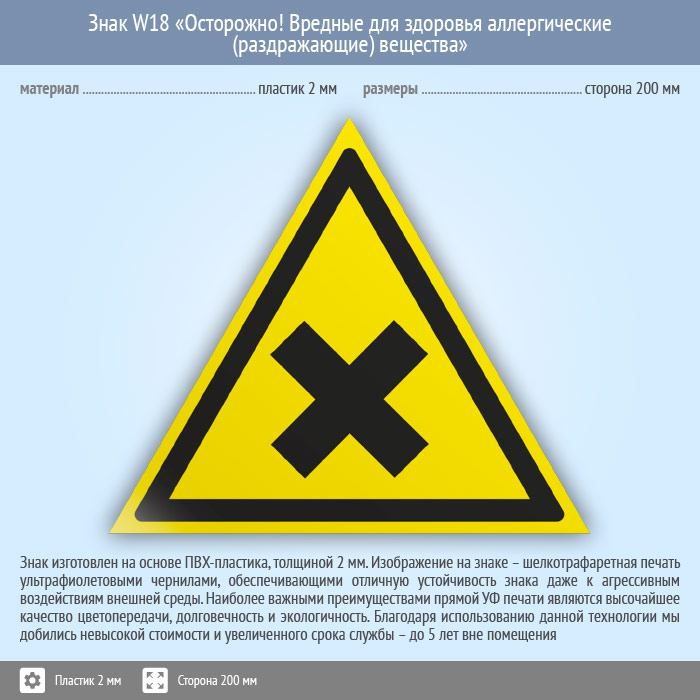 Знак W18 «Осторожно! вредные для здоровья аллергические (раздражающие) вещества» (пластик, сторона 200 мм) в Кашире купить