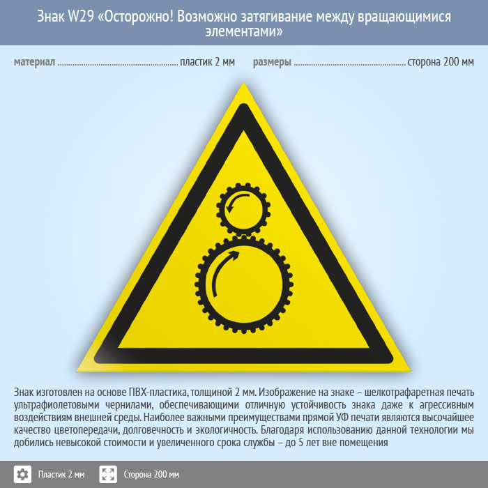 Знак W29 «Осторожно! возможно затягивание между вращающимися элементами» (пластик, сторона 200 мм) в Кашире купить