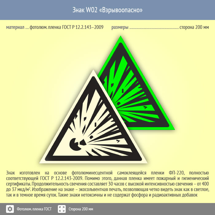 Знак W02 «Взрывоопасно» (фотолюминесцентная пленка ГОСТ 34428-2018, сторона 200 мм) в Кашире купить