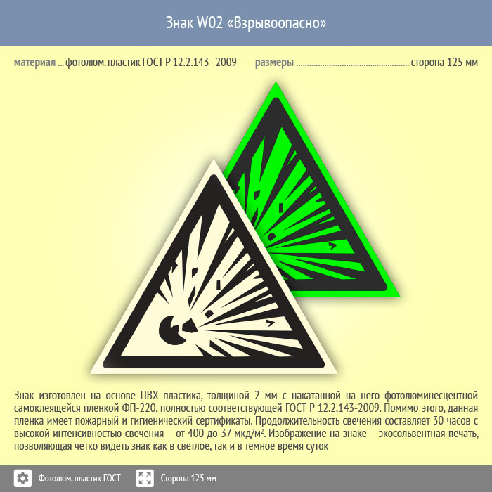 Знак W02 «Взрывоопасно» (фотолюминесцентный пластик ГОСТ 34428-2018, сторона 125 мм) в Кашире купить