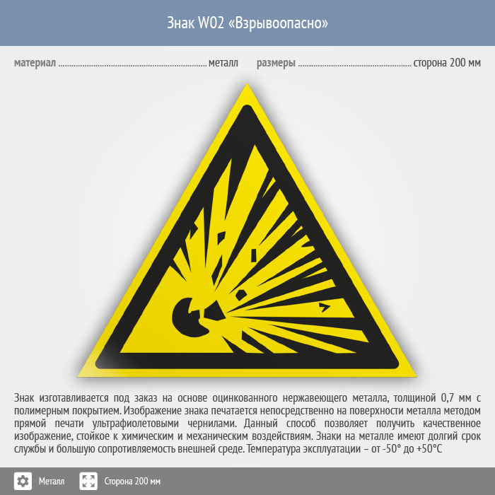 Знак W02 «Взрывоопасно» (металл, сторона 200 мм) в Кашире купить