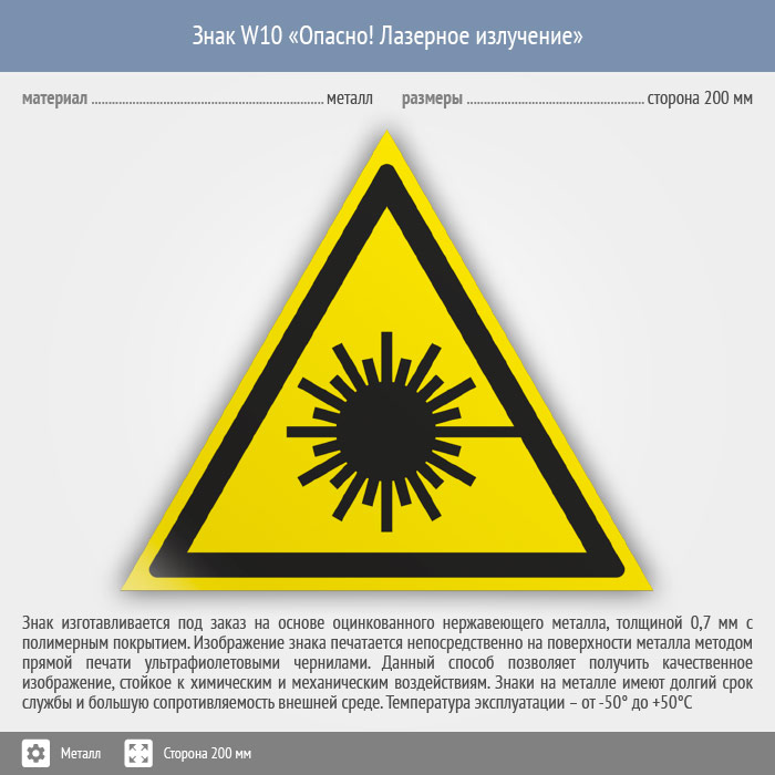 Знак W10 «Опасно! лазерное излучение» (металл, сторона 200 мм) в Кашире купить