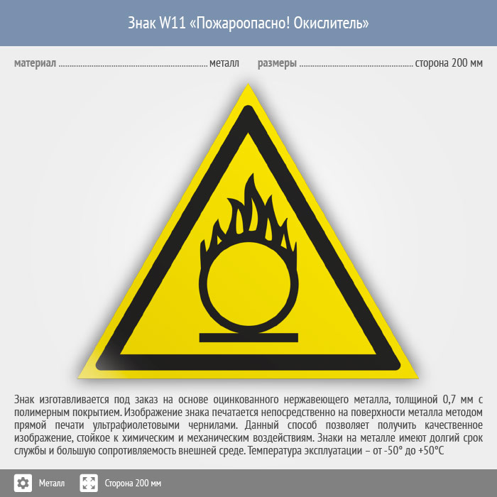 Знак W11 «Пожароопасно! окислитель» (металл, сторона 200 мм) в Кашире купить