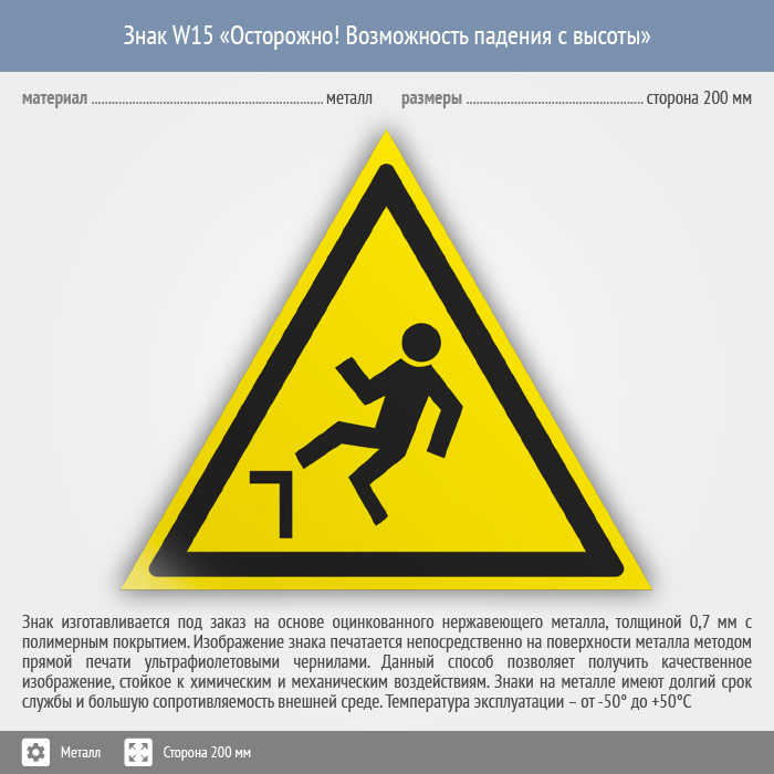 Знак W15 «Осторожно! возможность падения с высоты» (металл, сторона 200 мм) в Кашире купить