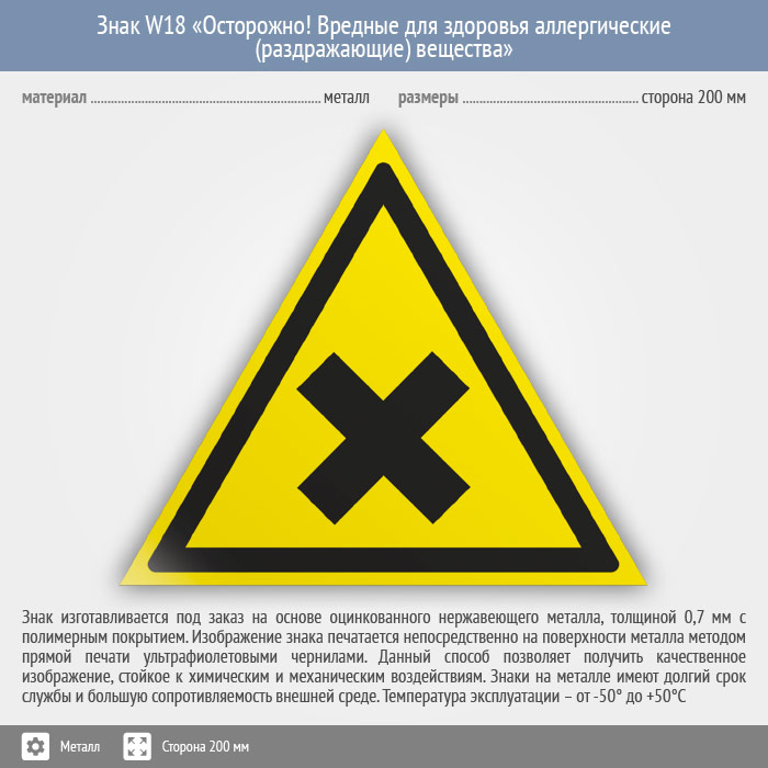 Знак W18 «Осторожно! вредные для здоровья аллергические (раздражающие) вещества» (металл, сторона 200 мм) в Кашире купить