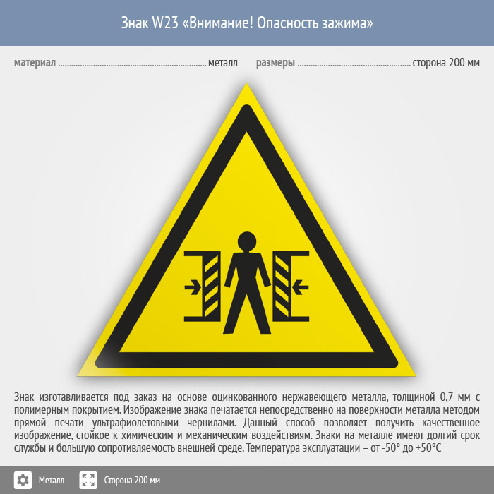 Знак W23 «Внимание! опасность зажима» (металл, сторона 200 мм) в Кашире купить