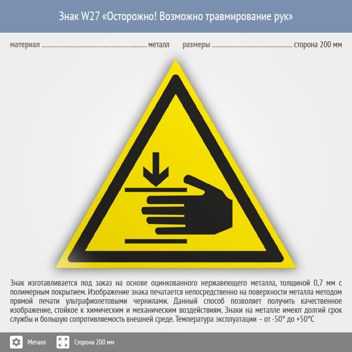 Знак W27 «Осторожно! возможно травмирование рук» (металл, сторона 200 мм) в Кашире купить