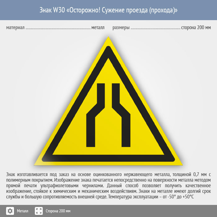 Знак W30 «Осторожно! сужение проезда (прохода)» (металл, сторона 200 мм) в Кашире купить