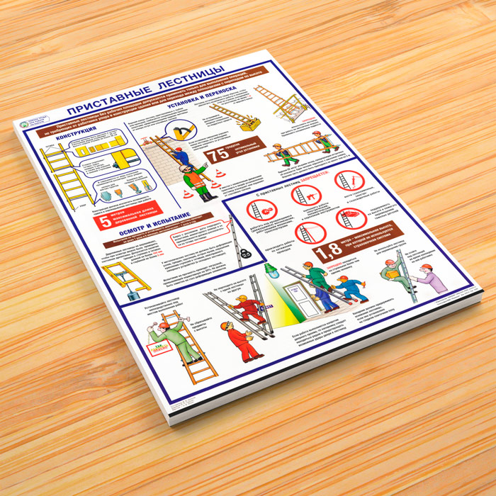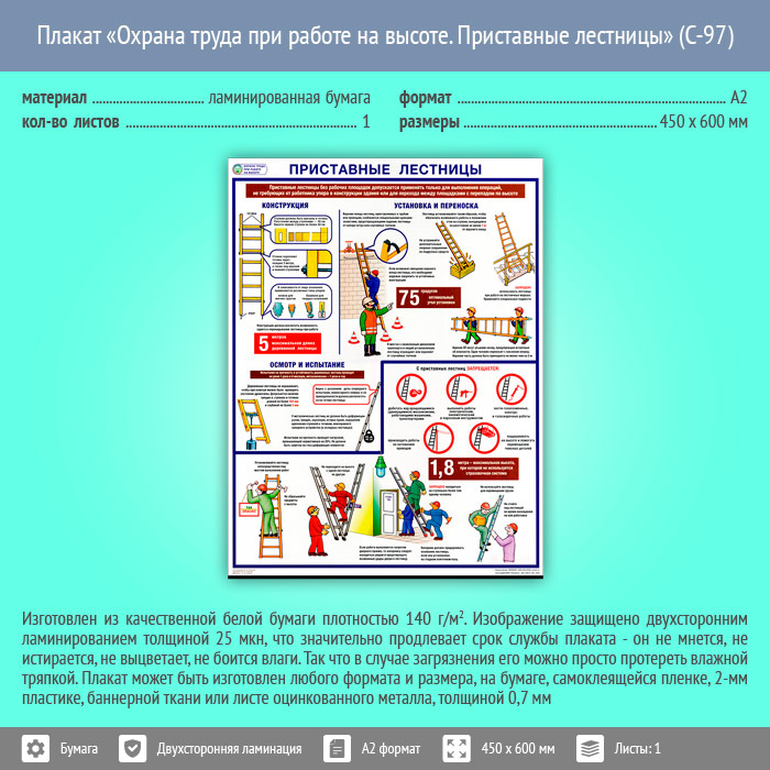 Плакат «Охрана труда при работе на высоте. Приставные лестницы» (С-97, ламинированная бумага, А2, 1 лист) в Кашире купить
