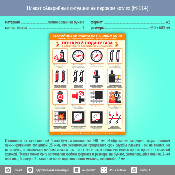 Плакат «Аварийные ситуации на паровом котле» (М-114, ламинированная бумага, А2, 1 лист) в Кашире купить