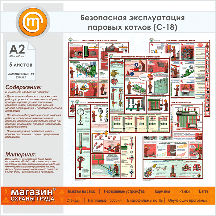 Плакаты «Безопасная эксплуатация паровых котлов» (С-18, ламинированная бумага, А2, 5 листов) в Кашире купить