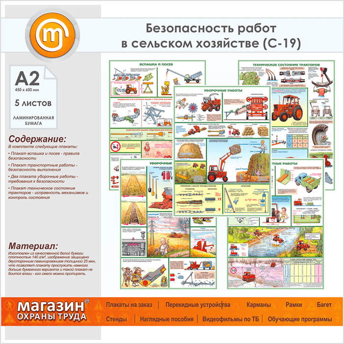 Плакаты «Безопасность работ в сельском хозяйстве» (С-19, ламинированная бумага, А2, 5 листов) в Кашире купить