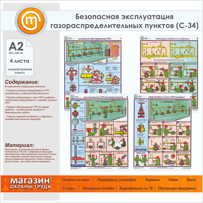 Плакаты «Безопасная эксплуатация газораспределительных пунктов» (С-34, ламинированная бумага, А2, 4 листа) в Кашире купить