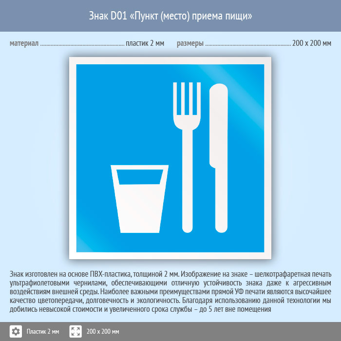 Знак D01 «Пункт (место) приема пищи» (пластик, 200х200 мм) в Кашире купить
