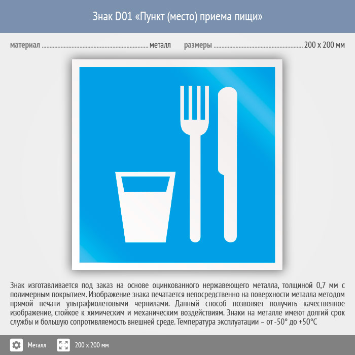 Знак D01 «Пункт (место) приема пищи» (металл, 200х200 мм) в Кашире купить