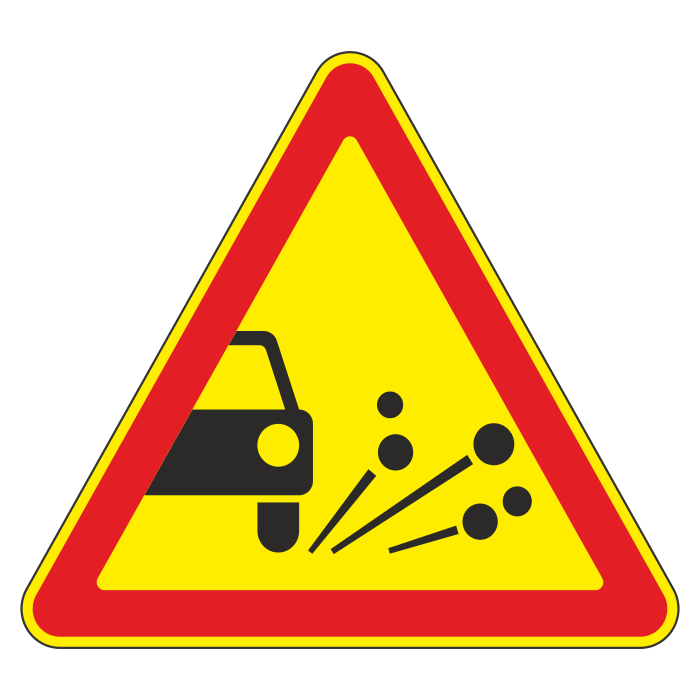Дорожный знак 1.18 «Выброс гравия» (временный) (металл 0,8 мм, II типоразмер: сторона 900 мм, С/О пленка: тип А коммерческая) в Кашире купить