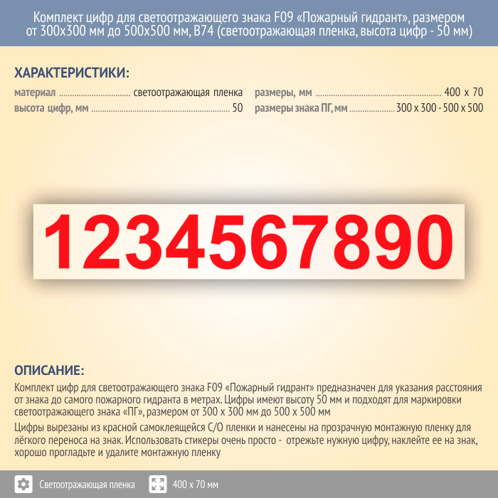 Комплект цифр для светоотражающего знака F09 «Пожарный гидрант», размером от 300х300 мм до 500х500 мм, В74 (светоотражающая пленка, 400х70 мм, высота цифр - 50 мм) в Кашире купить