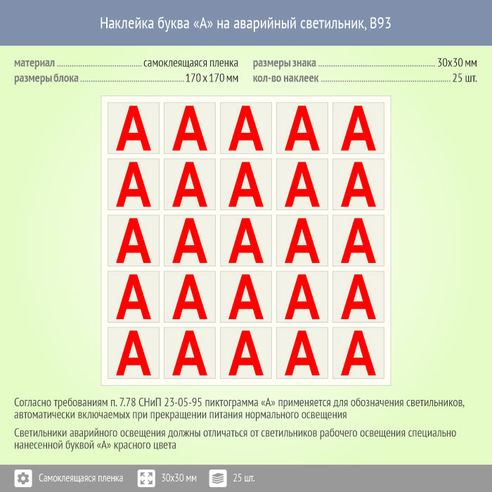 Наклейка буква «А» на аварийный светильник, B93 (пленка, 30х30 мм, блок 25 штук, 170х170 мм) в Кашире купить