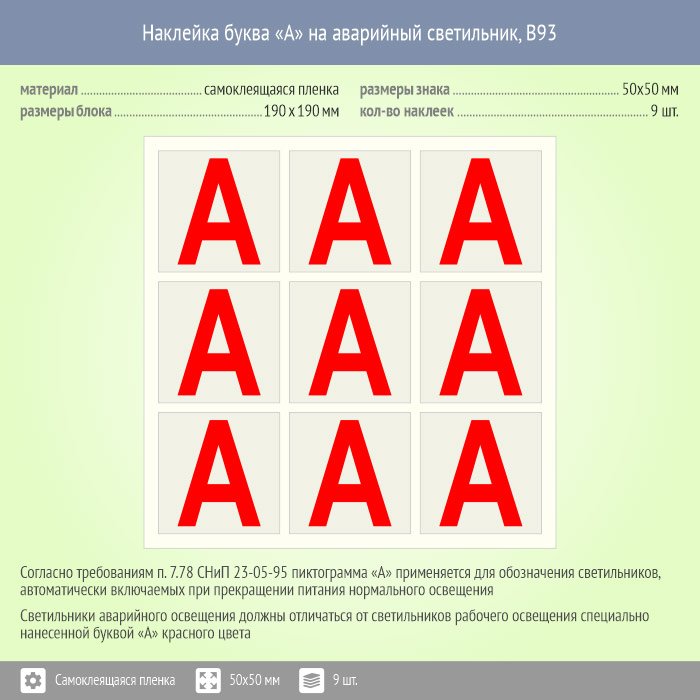 Наклейка буква «А» на аварийный светильник, B93 (пленка, 50х50 мм, блок 9 штук, 190х190 мм) в Кашире купить