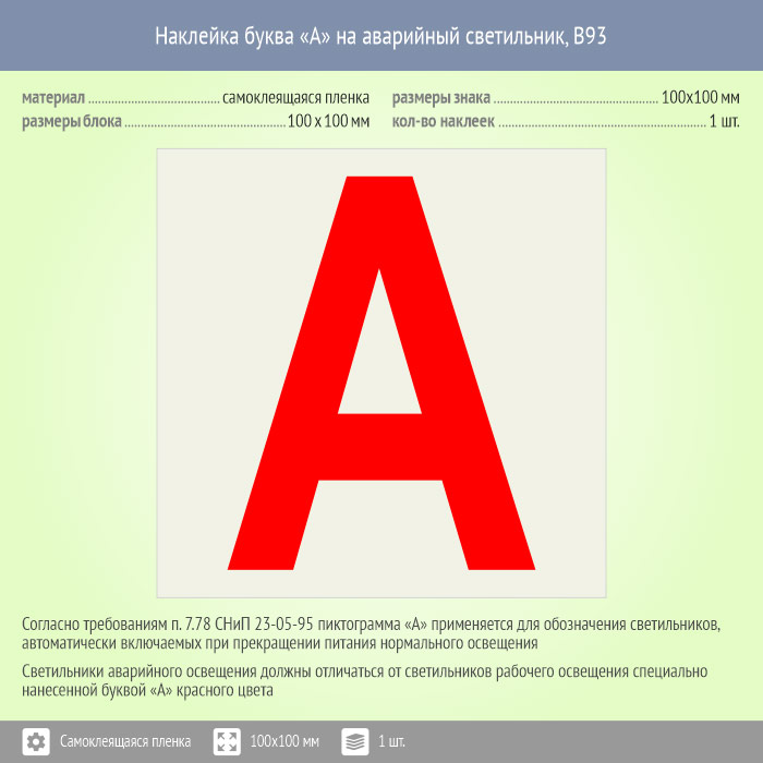 Наклейка буква «А» на аварийный светильник, B93 (пленка, 100х100 мм) в Кашире купить