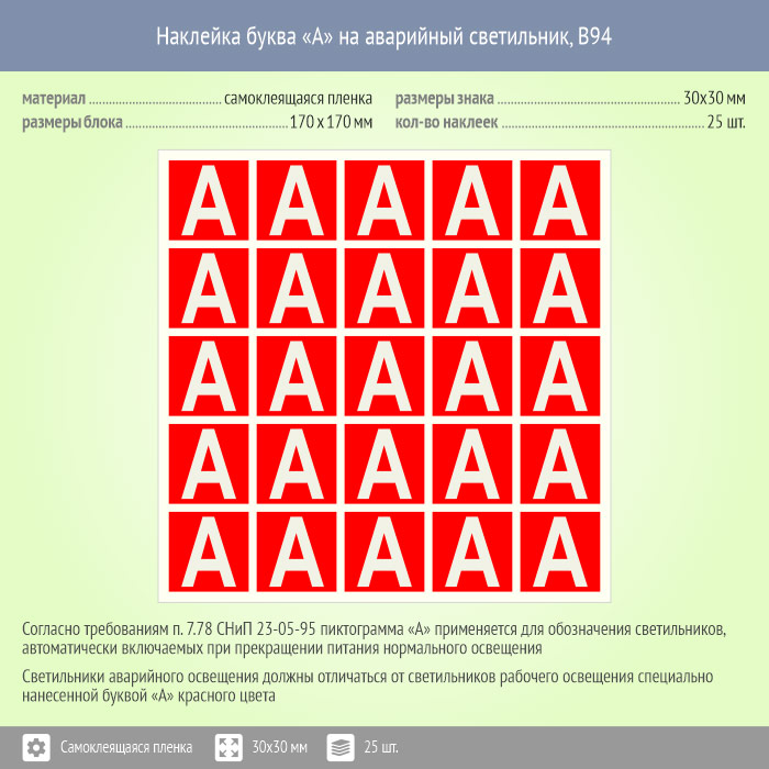 Наклейка буква «А» на аварийный светильник, B94 (пленка, 30х30 мм, блок 25 штук, 170х170 мм) в Кашире купить