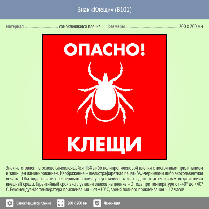 Знак «Опасно! Клещи», B101 (пленка c ламинированием, 200х200 мм) в Кашире купить