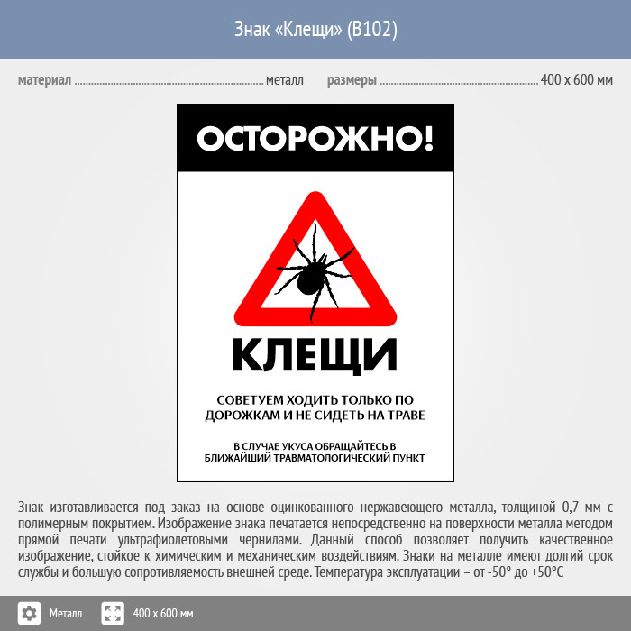 Знак «Осторожно! Клещи», B102 (металл, 300х400 мм) в Кашире купить