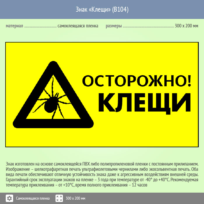 Знак «Осторожно! Клещи», B104 (пленка, 400х300 мм) в Кашире купить