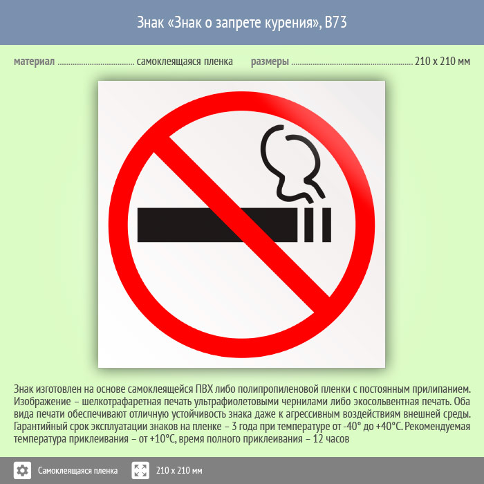Знак «Знак о запрете курения», B73 (пленка, 210х210 мм) в Кашире купить