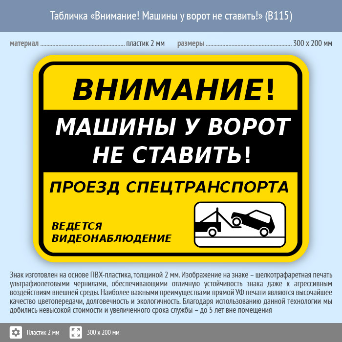 Табличка «Внимание! Машины у ворот не ставить!», B115 (пластик, 300х200 мм) в Кашире купить
