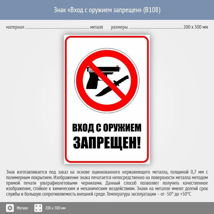 Знак «Вход с оружием запрещен», B108 (металл, 200х300 мм) в Кашире купить