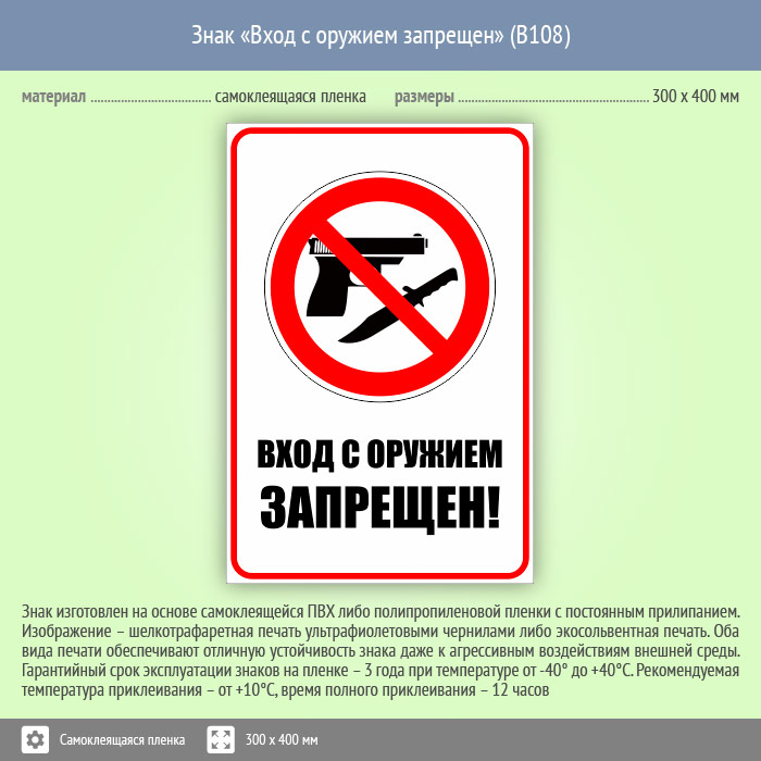 Знак «Вход с оружием запрещен», B108 (пленка, 300х400 мм) в Кашире купить