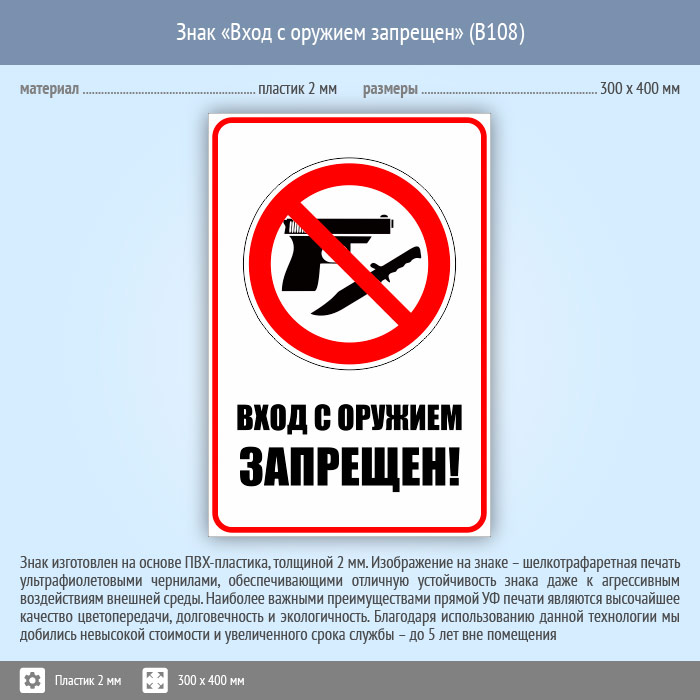 Знак «Вход с оружием запрещен», B108 (пластик, 300х400 мм) в Кашире купить