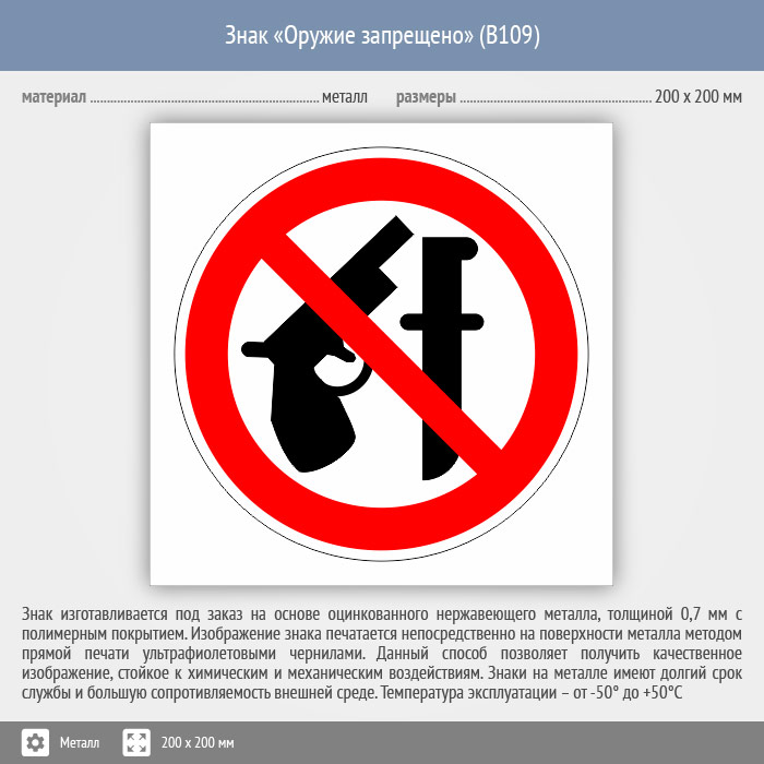 Знак «Оружие запрещено», B109 (металл, 200х200 мм) в Кашире купить