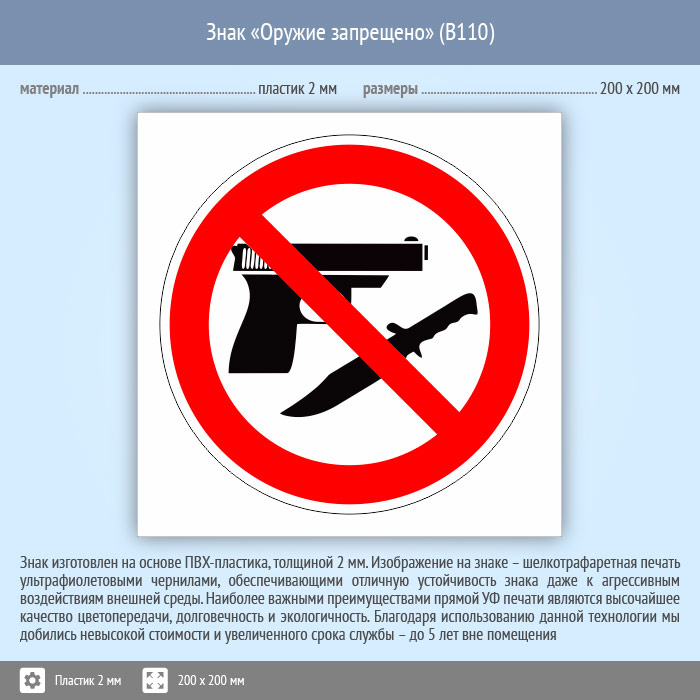 Знак «Оружие запрещено», B110 (пластик, 200х200 мм) в Кашире купить
