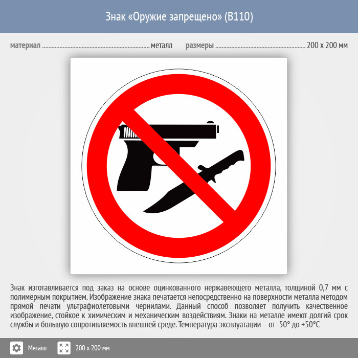 Знак «Оружие запрещено», B110 (металл, 200х200 мм) в Кашире купить