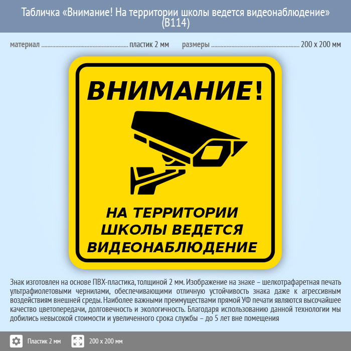 Табличка «Внимание! На территории школы ведется видеонаблюдение», B114 (пластик, 200х200 мм) в Кашире купить