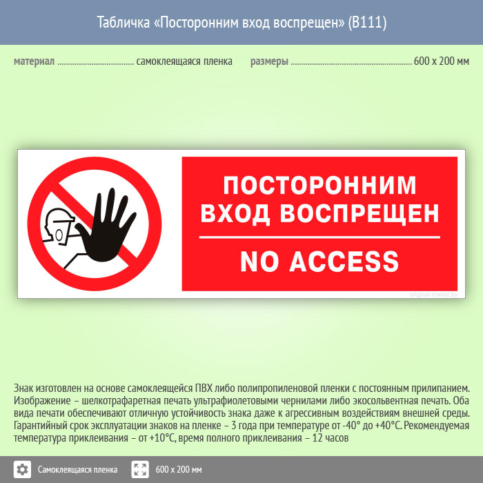 Табличка «Посторонним вход воспрещен», B111 (пленка, 600х200 мм) в Кашире купить