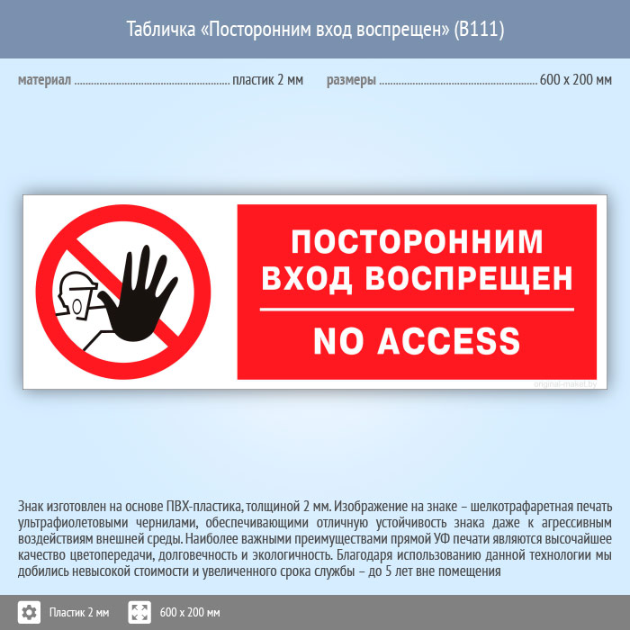 Табличка «Посторонним вход воспрещен», B111 (пластик, 600х200 мм) в Кашире купить