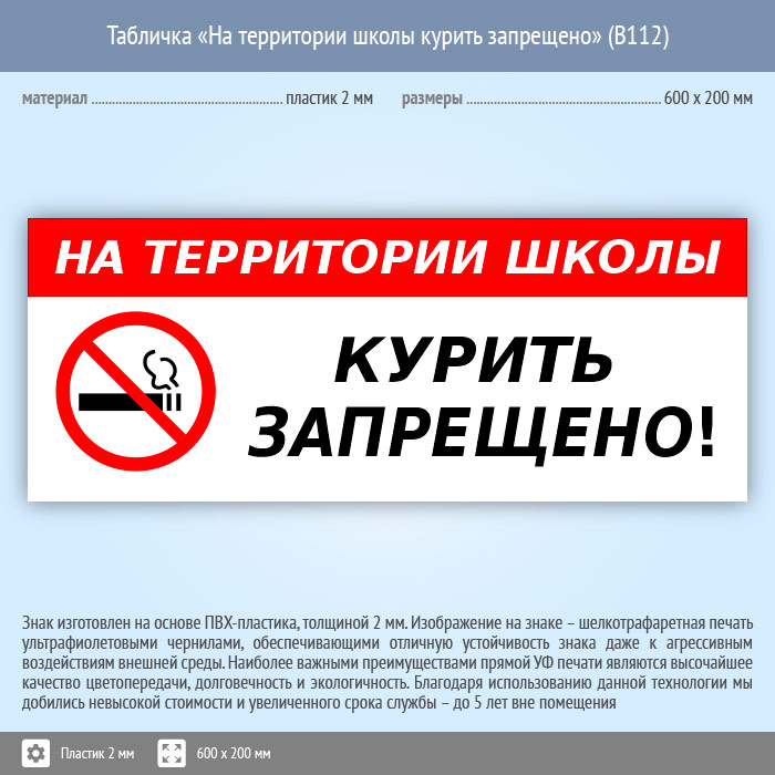 Табличка «На территории школы курить запрещено», B112 (пластик, 600х200 мм) в Кашире купить